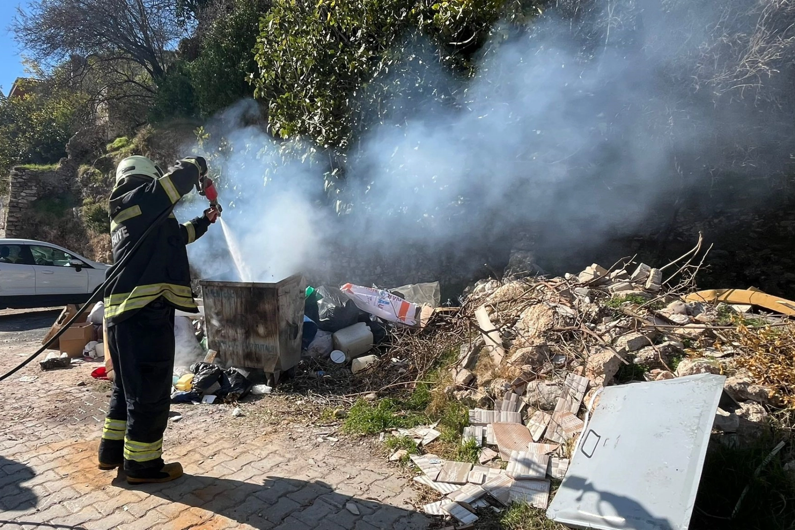 Muğla’nın Menteşe ilçesi Saburhane Mahallesi’nde çöp konteynerinde henüz belirlenemeyen bir nedenle yangın çıktı. Alevleri fark eden vatandaşların ihbarı üzerine bölgeye Muğla Büyükşehir Belediyesi İtfaiye Daire Başkanlığı ekipleri sevk edildi. Kısa sürede olay yerine ulaşan itfaiye ekipleri yangına müdahale ederek alevleri büyümeden kontrol altına aldı.