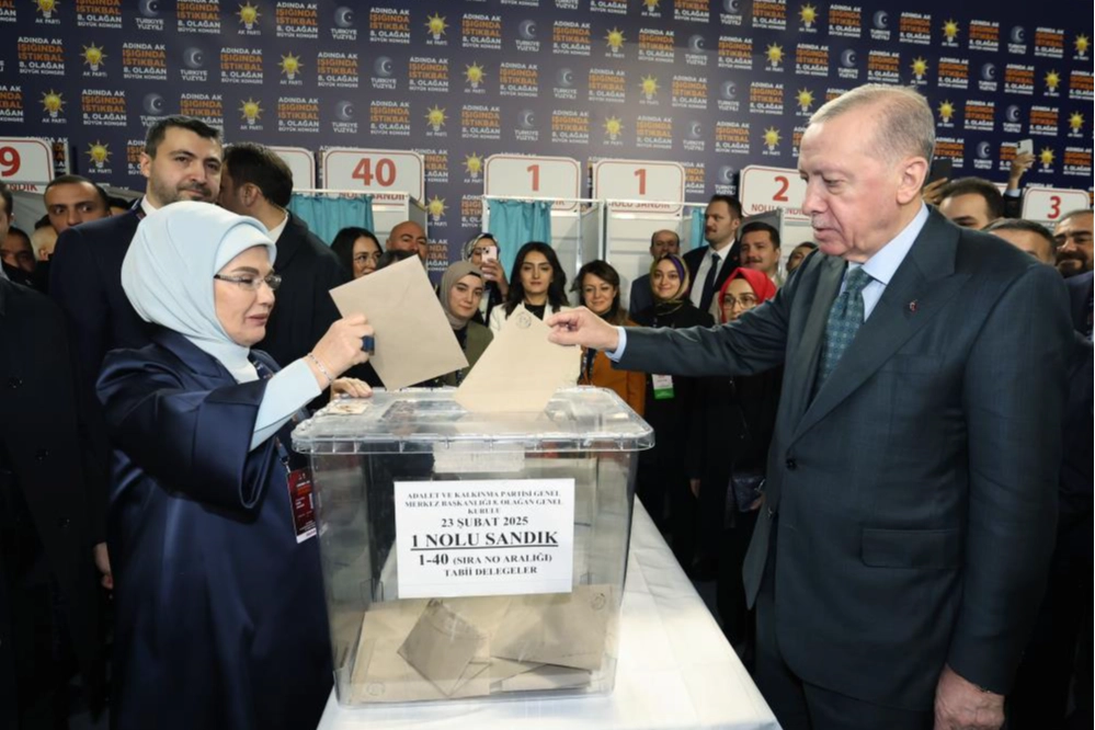 Ankara Spor Salonu'nda düzenlenen kongrede Genel Başkanlığa tekrar aday gösterilen Erdoğan, eşi Emine Erdoğan ile geldiği salonda, oyunu 1 No'lu sandıkta kullandı.