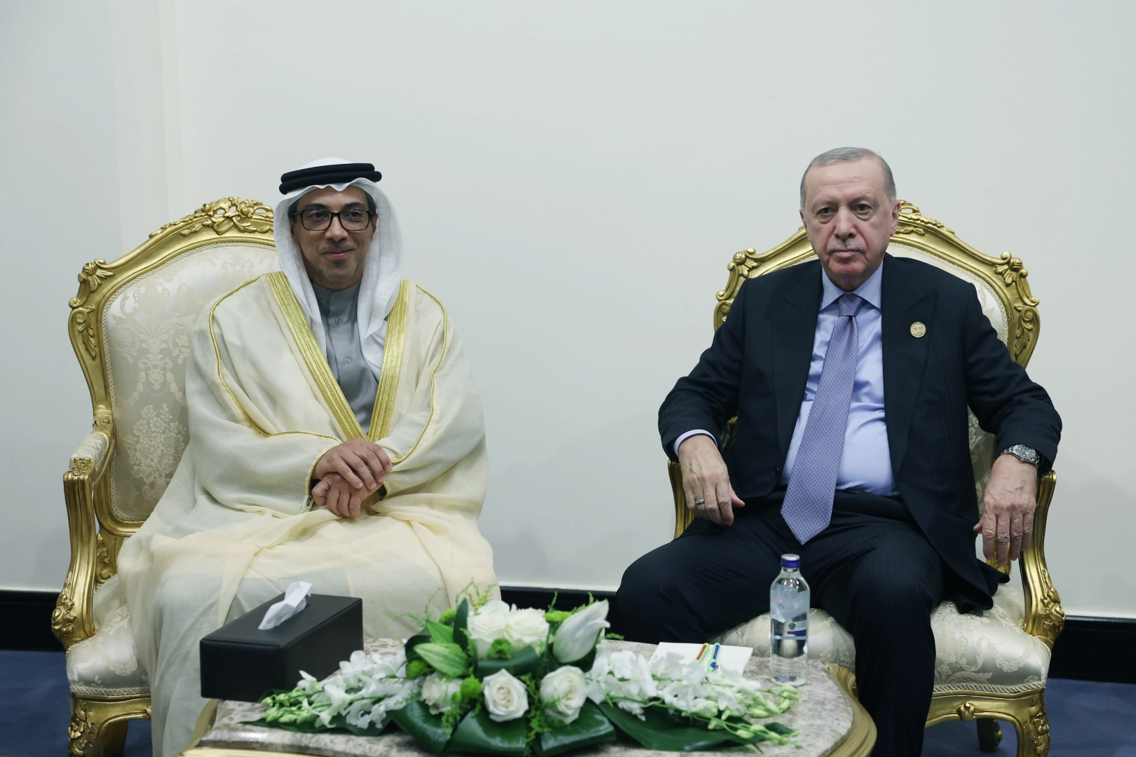 Cumhurbaşkanı Recep Tayyip Erdoğan, Gazze konulu Barış Zirvesi'ne katılmak üzere geldiği Mısır'da temaslarına başladı. Erdoğan, Şarm Eş-Şeyh kentinde gerçekleştirilecek zirve öncesinde BAE Devlet Başkan Yardımcısı Şeyh Mansur bin Zayid Al Nahyan ile görüştü. İkili ilişkiler ve Gazze konusu ele alındı Toplantıda, Türkiye ile BAE arasındaki ikili ilişkiler, bölgesel ve küresel konular ele alındı. Cumhurbaşkanı Erdoğan, Türkiye ile BAE arasındaki siyasi ilişkilerin geliştirilmesinin ticaret ve yatırım alanlarındaki iş birliğine de katkı sağladığını, savunma sanayii başta olmak üzere diğer konularda da ilerleme için gayret gösterdiklerini ifade etti. Cumhurbaşkanı Erdoğan, Türkiye'nin Gazze'deki soykırımın sona ermesi için çalıştığını, kalıcı barışa dair bir fırsat penceresi aralandığını, bunun iyi değerlendirilmesi gerektiğini belirtti. Cumhurbaşkanı Recep Tayyip Erdoğan, ateşkes anlaşmasının tam olarak uygulanması gerektiğini, insani yardımların Gazze'ye kesintisiz ulaştırılmasının ve yeniden imar için çalışmaların derhal başlatılmasının önemli olduğunu ifade etti.