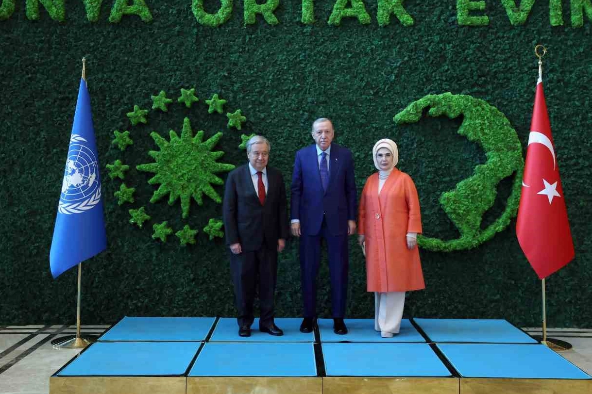 Genel Sekreter Guterres'in gelecek nesillere yaşanabilir bir dünya bırakma hedefi için büyük bir özveriyle çalıştığına şahit olduğunu dile getiren Erdoğan, "Bu vesileyle kendilerinin bilhassa iklim değişikliğiyle mücadele alanında başlattığı girişimlerin önemini vurgulamak istiyorum. Türkiye olarak bu çalışmalara katkıda bulunma hedefiyle Kasım 2026'da Birleşmiş Milletler İklim Değişikliği Çerçeve Sözleşmesi 31'inci Taraflar Konferansı'na ev sahipliği yapmaya hazırlanıyoruz. Eşim Emine Erdoğan'ın öncülüğünde 2017 yılında başlattığımız Sıfır Atık Projesi'nin küresel bir girişime dönüşmesini sağlayan, Birleşmiş Milletler sürecinde desteğini esirgemeyen ve Küresel Sıfır Atık İyi Niyet Beyanı'nın ilk imzacılarından olan Sayın Guterres'e bir kez daha teşekkürlerimi iletiyorum. İstanbul'u bir Birleşmiş Milletler merkezi haline getirme vizyonumuz doğrultusunda teşkilatın ofislerini aynı çatı altında toplayacak Birleşmiş Milletler Evi projemizi hayata geçirmeye hazır haldeyiz. Bu projenin Sayın Genel Sekreter'in Birleşmiş Milletler 80 girişimine de ulusal düzeyde önemli katkı sunacağını düşünüyorum" ifadelerini kullandı.