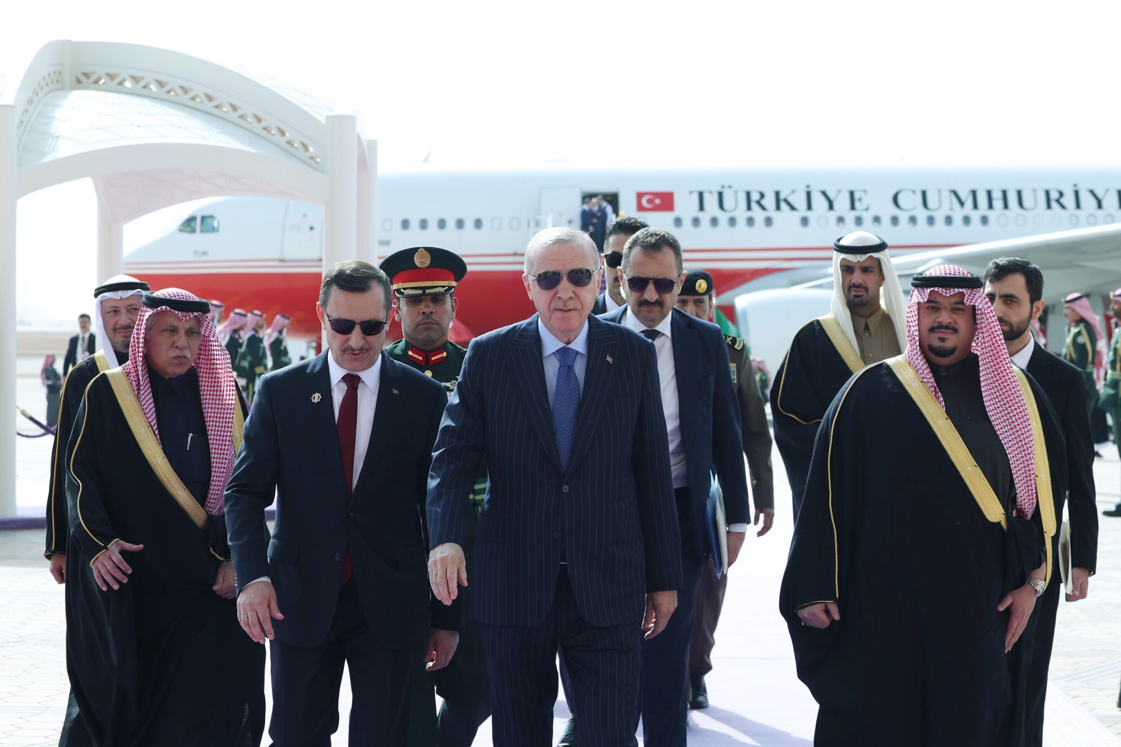 Erdoğan ile eşi Emine Erdoğan, Dışişleri Bakanı Hakan Fidan, Hazine ve Maliye Bakanı Mehmet Şimşek, Aile ve Sosyal Hizmetler Bakanı Mahinur Özdemir Göktaş, Enerji ve Tabii Kaynaklar Bakanı Alparslan Bayraktar, Sanayi ve Teknoloji Bakanı Mehmet Fatih Kacır, Gençlik ve Spor Bakanı Osman Aşkın Bak, Milli Savunma Bakanı Yaşar Güler, Sağlık Bakanı Kemal Memişoğlu, Cumhurbaşkanlığı İletişim Başkanı Burhanettin Duran, Cumhurbaşkanı Dış Politika ve Güvenlik Başdanışmanı Akif Çağatay Kılıç ile bazı yetkililer de Suudi Arabistan'a geldi.