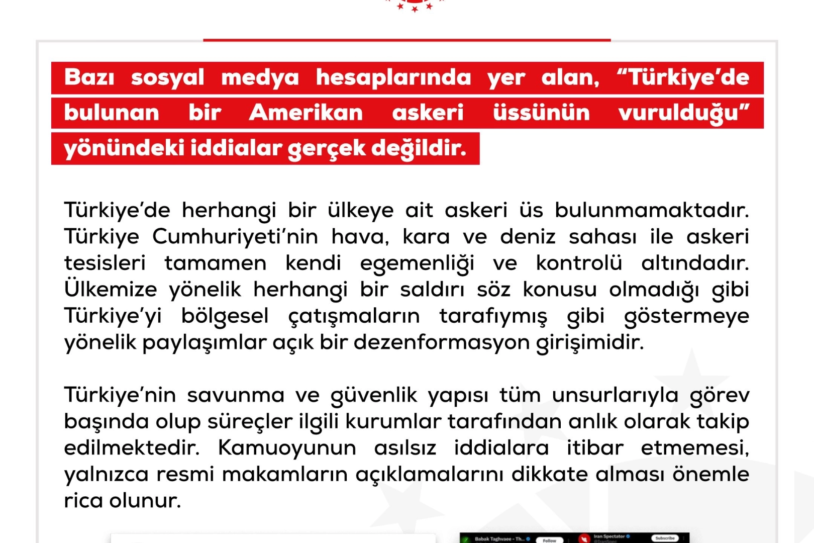 DMM konuya ilişkin açıklamasında Türkiye'de yabancı bir ülkeye ait askeri üssün bulunmadığı ve iddiaların yalan olduğunu duyurdu. Açıklamada, "Bazı sosyal medya hesaplarında yer alan, Türkiye'de bulunan bir Amerikan askeri üssünün vurulduğu" yönündeki iddialar gerçek değildir. Türkiye'de herhangi bir ülkeye ait askeri üs bulunmamaktadır. Türkiye Cumhuriyeti'nin hava, kara ve deniz sahası ile askeri tesisleri tamamen kendi egemenliği ve kontrolü altındadır. Ülkemize yönelik herhangi bir saldırı söz konusu olmadığı gibi Türkiye'yi bölgesel çatışmaların tarafıymış gibi göstermeye yönelik paylaşımlar açık bir dezenformasyon girişimidir. Türkiye'nin savunma ve güvenlik yapısı tüm unsurlarıyla görev başında olup süreçler ilgili kurumlar tarafından anlık olarak takip edilmektedir. Kamuoyunun asılsız iddialara itibar etmemesi, yalnızca resmi makamların açıklamalarını dikkate alması önemle rica olunur" denildi.