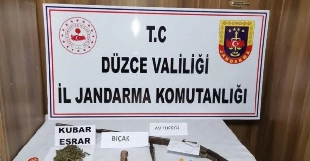 Düzce Merkez ilçe jandarma komutanlığı ekipleri tarafından Akınlar Mahallesinde devriyesi esnasında durdurulan T. E. isimli şahsın üst aramasında 50 gram kubar esrar, çantasında da 30 santim uzunluğunda ekmek bıçağı olarak tabir edilen kesici alet ele geçirilmiştir. Şahsa ait konut ve eklentilerine adli arama sonucunda da 1 adet seri numarasız ruhsatsız tek kırma av tüfeği ile 8 adet 16 kalibre fişek bulundu. Olayla ilgili olarak tahkikat başlatıldı.