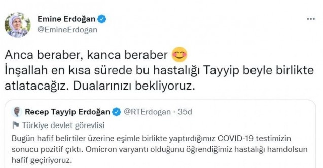 Cumhurbaşkanı Erdoğan’ın eşi Emine Erdoğan ile beraber Covid-19’a yakalandıklarını duyurduğu paylaşımı alıntılayan Emine Erdoğan, yaptığı paylaşımda, “Anca beraber, kanca beraber. İnşallah en kısa sürede bu hastalığı Tayyip Bey’le birlikte atlatacağız. Dualarınızı bekliyoruz” ifadelerini kullandı.