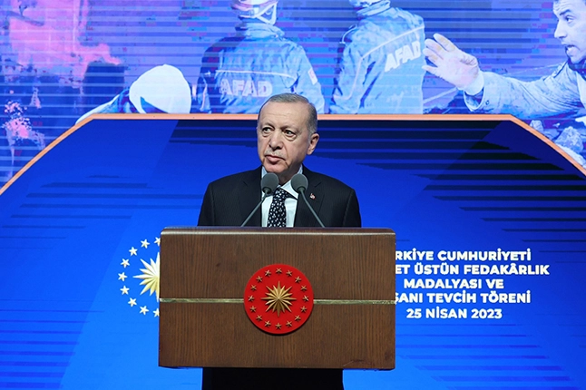 Erdoğan, depremle mücadelenin sembolleşen isimlerine, kurumlarına, ekiplerine ve onların yerli, yabancı temsilcilerine üstün fedakarlık madalyası ve nişanı takdim edeceklerini bildirdi.