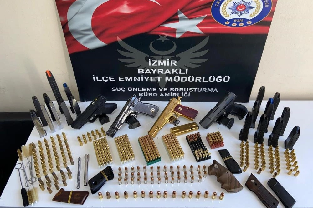 Bayraklı İlçe Emniyet Müdürlüğü Suç Önleme ve Soruşturma Büro Amirliği ekipleri, ilçedeki bir evde çok sayıda ruhsatsız tabanca ve mühimmat bulunduğuna dair bilgi üzerine çalışma başlattı. Savcılıktan alınan talimatla adrese gerçekleştirilen operasyonda, 4 ruhsatsız tabanca, 22 şarjör, 433 fişek ve tabancalara ait parçalar ele geçirildi. Olayla ilgili ev sahibi S.K. gözaltına alınırken, şüpheli hakkında adli işlem başlatıldı.