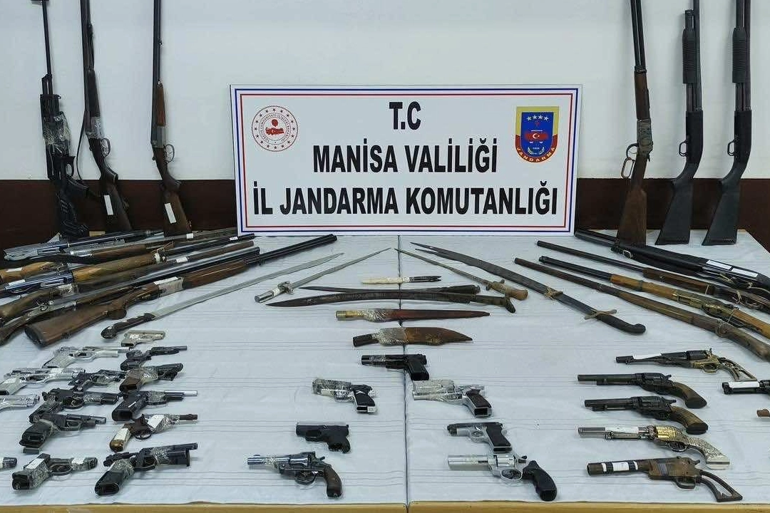 Manisa İl Jandarma Komutanlığı İstihbarat ve Kaçakçılık Organize Suçlarla Mücadele (KOM) Şube Müdürlükleri koordinesinde, Kırkağaç, Soma ve Akhisar İlçe Jandarma Komutanlıkları ekiplerinin katılımıyla M.E.Y. (34), B.N. (47), A.E. (58) ve S.A.Y. (44) isimli şahıslara ait ev ve iş yerlerine eş zamanlı operasyon düzenlendi. Yapılan aramalarda, 31 adet ruhsatsız tabanca, 19 adet ruhsatsız av tüfeği, tabancalara ait çok sayıda fişek, şarjör ve çeşitli tabanca parçaları, 4 adet kılıç, 4 adet kama ele geçirildi. Ele geçirilen malzemelere el konulurken, gözaltına alınan şahıslar, işlemlerinin ardından adliyeye sevk edildi.