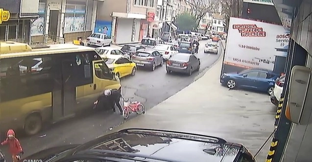 Olay dün saat 16.00 sıralarında Eyüpsultan Merkez Mahallesi Silahtarağa Caddesi’nde meydana geldi. Edinilen bilgilere göre, elinde bisiklet ile kaldırımda yürüyen kadın dengesini kaybederek yola düştü. O sırada yoldan geçen minibüsün arka tekerleğine kafası çarpan kadın aracın altında kalmaktan ise son anda kurtuldu. Kadının düştüğünü gören çevredeki vatandaşlar hemen yardımına koşarak sağlık ekiplerine haber verdi. Başından hafif şekilde yaralanan kadına ilk müdahale, vatandaşların ihbarı üzerine olay yerine gelen sağlık ekipleri tarafından yapıldı. Durumunun iyi olduğu öğrenilen kadının yaşadığı korku dolu anlar güvenlik kamerasına saniye saniye yansıdı.