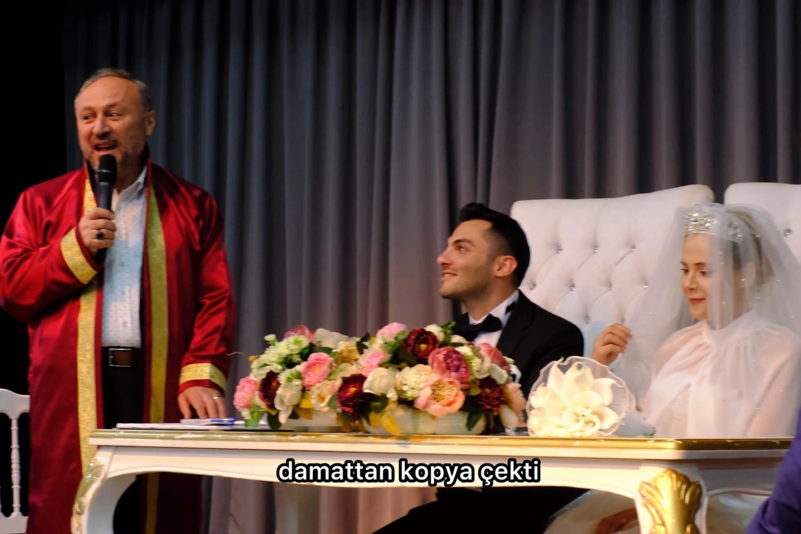 Canik Kültür Merkezi’nde dünya evine giren Muhammet Fatih Ukde ve Gülşah Diloğlu çiftinin nikah töreninde renkli anlar yaşandı. Nikah memuru, gelin Gülşah Diloğlu’na "Evlenmeyi kabul ediyor musunuz?" sorusunu yönelttiği sırada, damat Muhammet Fatih Ukde gelinin kulağına "Evet de" diye fısıldadı. Bu durumu fark eden nikah memuru, gülümseyerek "Bu evet sayılmaz. Damattan kopya çekti. Damat sufle verdi. Yani baskı var. Damadın 2 hakkı kaldı, birini kullandı" diyerek esprili bir dille, bu kez "Kimsenin baskısında kalmadan ki damat dahil, evlenmeyi kabul ediyor musun?" şeklinde sorarak gelinden yanıtı tekrarlamasını istedi. Bu kez gelin, kimsenin yönlendirmesi olmadan, hatta kulaklarını kapatarak "Evet" dedi. Nikah memurunun sempatik tavırları ve çiftin keyifli halleri törene katılanları kahkahaya boğarken, o anlar da kameralara yansıdı.