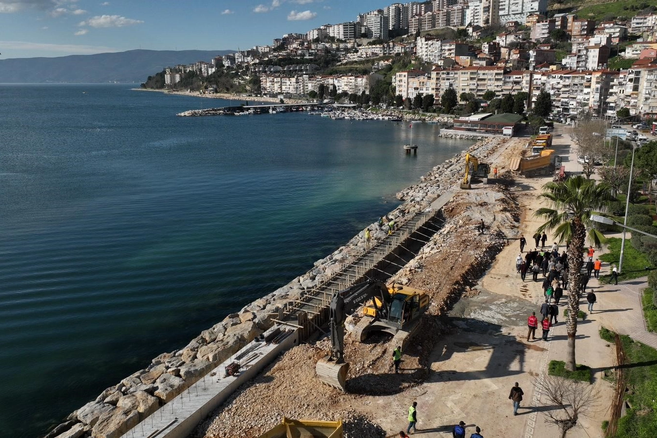 Büyükşehir Belediyesi tarafından Gemlik Körfezi kıyı bandında 47 bin metrekarelik alanda yürütülen çalışmalarla, sahil hattı deniz taşkınlarına karşı korunurken, bölgeye modern sosyal yaşam alanları kazandırılıyor. Bursa Büyükşehir Belediye Başkanı Mustafa Bozbey projeyi yerinde inceleyerek yetkililerden bilgi aldı. Bölgedeki çalışmaların sistemli şekilde devam ettiğini söyleyen Başkan Mustafa Bozbey, proje kapsamında bölgenin zemininden balıkçı barınaklarına kadar birçok noktanın yenileneceğini söyledi. Yüksek dalga riskine karşı set oluşturacak nitelikteki uygulamaların da yapıldığını söyleyen Başkan Bozbey, "Vatandaşlarımız için keyifli vakit geçirebilecekleri yeni sosyal alanlar oluşturacağız. İnsan odaklı hizmet anlayışımız doğrultusunda birçok yeni uygulamayı burada sunacağız. Kısa süre içinde tamamlayacağımız projeyle hemşehrilerimiz bu alanda keyifli vakit geçirme imkanı bulacak. Tüm hemşehrilerimize hayırlı olsun" diye konuştu.