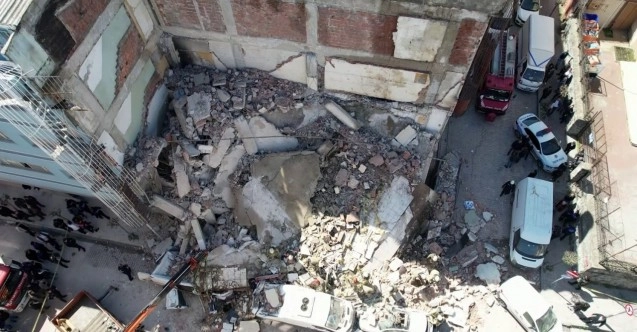 Güngören’de kentsel dönüşüm kapsamındaki çöken bina ve ekiplerin çalışması havadan görüntülendi.