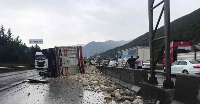 Sakarya’da D-650 Karayolu üzerinde kaygan zemin sebebiyle devrilen hafriyat kamyonundaki dolgu malzemeleri yola saçıldı.