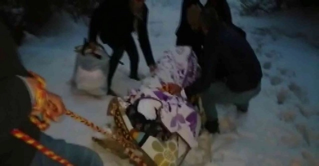 Hasta yakınları yaşlı kadını ambulansa ulaştırmak için tahtadan kızak yapıp taşıdı. Yaklaşık 1 kilometrelik mesafeyi kızakla ilerleyen hasta yakınları daha sonra mezrada bekleyen ambulansa hastayı ulaştırdı.