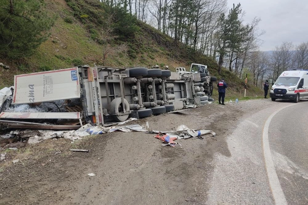 Kaza, saat 16.00 sıralarında İnegöl-Domaniç kara yolu İnegöl'ün Tahtaköprü Mahallesi mevkiinde meydana geldi. Domaniç istikametinden İnegöl'e seyir halinde olan Murat B.(39) yönetimindeki 16 BUT 870 plakalı su yüklü TIR, yokuş aşağı inerken frenlerinin patlaması sonucu sürücüsünün kontrolünden çıktı. Yoldan çıkan tır yamaca devrildi. Kaza yerine 112, jandarma ve itfaiye arama kurtarma ekipleri sevk edildi. Kaza sonucu yaralanan sürücü, tırın camı kırılarak ekiplerce kurtarıldı. Yaralı olay yerine sevk edilen ambulansla İnegöl Devlet Hastanesine kaldırıldı. Jandarma komutanlığı ekipleri kazayla ilgili soruşturma başlattı.