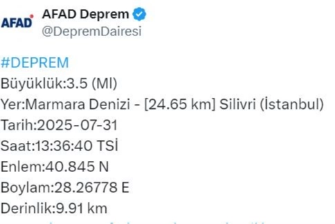 İstanbul'un Silivri açıklarında saat 13.36'da 3,5 büyüklüğünde bir deprem meydana geldi. AFAD'dan alınan bilgiye göre; Silivri açıkları Marmara Denizi’nde 3.5 şiddetinde deprem meydanda geldi. Sarsıntı, saat 13.36’da yerin 9.91 kilometre derinliğinde gerçekleşti. Şimdiye kadar olumsuz bir durumun yaşanmadığı öğrenildi.