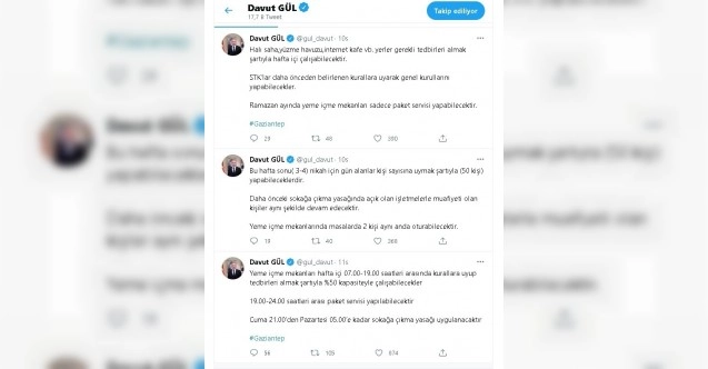 Hafta sonunda kısıtlamaların yeniden başlayacağı da hatırlatan Gül’ün mesajında "Yeme içme mekanları hafta içi 07.00-19.00 saatleri arasında kurallara uyup tedbirleri almak şartıyla yüzde 50 kapasiteyle çalışabilecekler. 19.00-24.00 saatleri arası paket servisi yapılabilecektir. Cuma 21.00’den Pazartesi 05.00’e kadar sokağa çıkma yasağı uygulanacaktır" denildi.