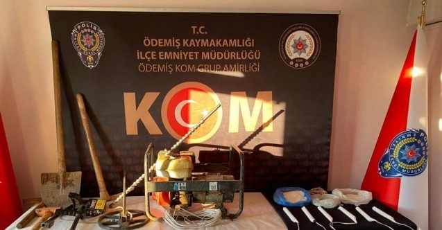 Ödemiş İlçe Emniyet Müdürlüğü Kaçakçılık ve Organize Suçlarla Mücadele Şube Müdürlüğü (KOM) ekipleri, kırsal Tosunlar Mahallesi’nde bulunan bir arazide kaçak kazı yapıldığı bilgisi üzerine harekete geçti. Sarp araziye yaya olarak giden ekipler, bölgeye Ödemiş Cumhuriyet Başsavcılığı koordinesinde operasyon düzenledi. Polis ekipleri tarafından F.A., L.Ç., M.Ö., M.T., E.A., R.A., T.A., A.D. ve T.Y. adlı 9 şüpheli, kaçak kazı yaparken suç üstü yakalandı. Kazı alanında yapılan aramada, 1 el jeneratörü, 1 el dedektörü ve kazı çalışmalarında kullanılan kazma, kürek, çekiç ve balyoz gibi malzemeler ele geçirildi.