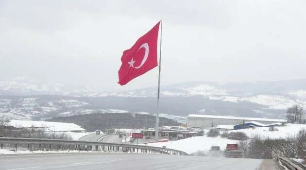 Samsun’da hava sıcaklığının mevsim normallerinin altında seyir ederken kar yağışı ise yüksek kesimlerde etkili oluyor. Kavak ilçesi Samsun-Ankara karayolu kenarındaki bir akaryakıt istasyonunda bulunan 116 metre uzunluğundaki direkte asılı olan 450 kilo ağırlığında 2 bin metrekarelik dev Türk bayrağı ise kar yağışı altında muhteşem bir görüntü sergiliyor.