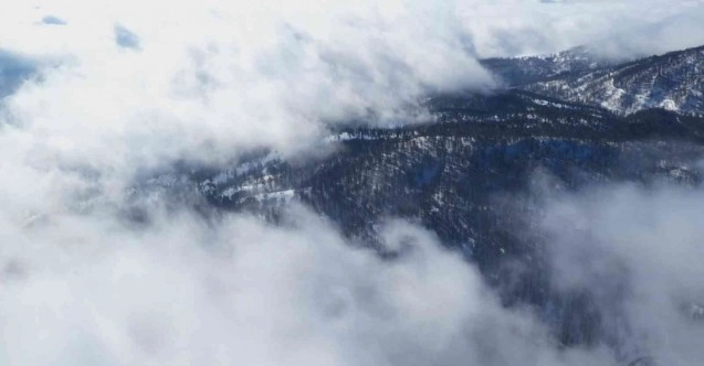 Beyaza bürünen Kartepe’de kar bulutlarının oluşturduğu manzara dron ile görüntülendi.