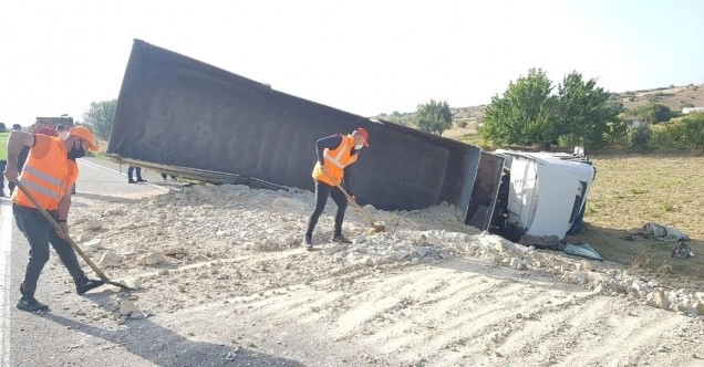 Öte yandan devrilen tırdaki kaya parçaları, karayoluna savruldu. Bir süre tek şeritten sağlanan trafik akışı, karayolları ekiplerinin çalışmalarının ardından yeniden normal seyrine döndü.