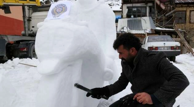 Önceki yıllarda nesli tükenmekte olan kutup ayıları ve 15 Temmuz hain darbe girişimini anlatan heykeller yapan Oral bu kez Şehit Polis Memuru Fethi Sekin’in kardan heykelini yaptı.