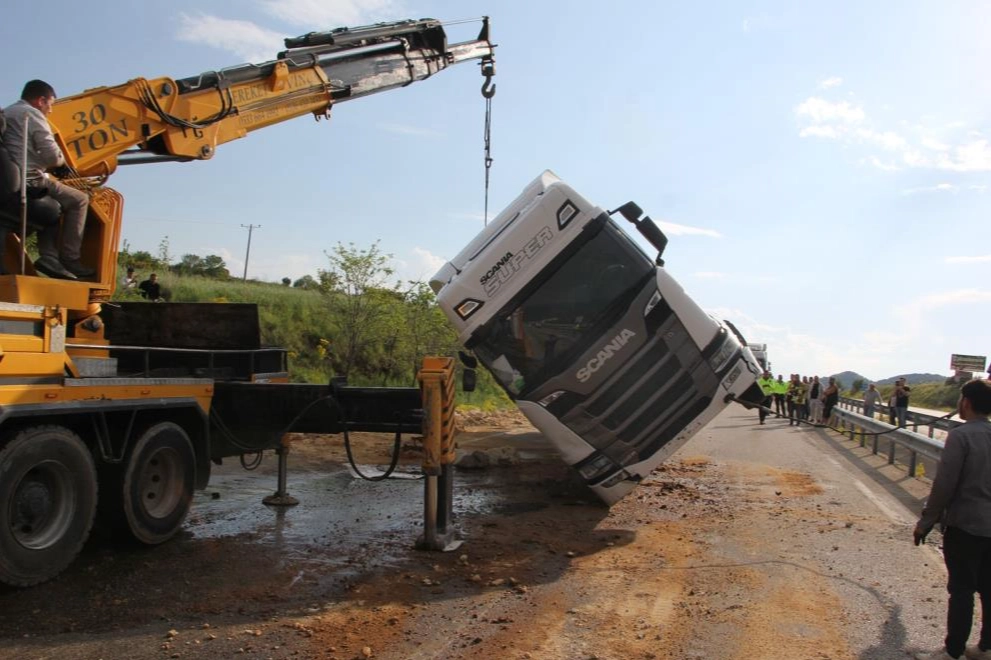 Devrilen taş yüklü tır nedeniyle İzmir-Ankara D300 karayolu bir süreliğine trafiğe kapatıldı. Kaza, saat 16.15 sıralarında Kula-Uşak karayolu Körez kavşağı yakınlarında meydana geldi. Edinilen bilgiye göre, Kula’dan Uşak istikametine seyir halinde olan Emrah G. yönetimindeki 43 ABF 560 plakalı taş yüklü tıra, Barış B. idaresindeki otomobil sollama yaptığı çarptı. Çarpışmanın etkisiyle tır yola devrilirken, otomobil şarampole savruldu. İhbar üzerine olay yerine polis, jandarma ve sağlık ekipleri sevk edildi. Ekiplerce yapılan incelemede, kazada yaralanan olmadığı belirlendi. Kaza nedeniyle İzmir-Ankara D300 karayolu, devrilen tırın kaldırılması çalışmaları süresince trafiğe kapatıldı. Uzun araç kuyruklarının oluştuğu yolda, ekiplerin yaklaşık bir saatlik çalışmasının ardından trafik akışı kontrollü şekilde yeniden sağlandı. Kaza ile ilgili soruşturma başlatıldı.