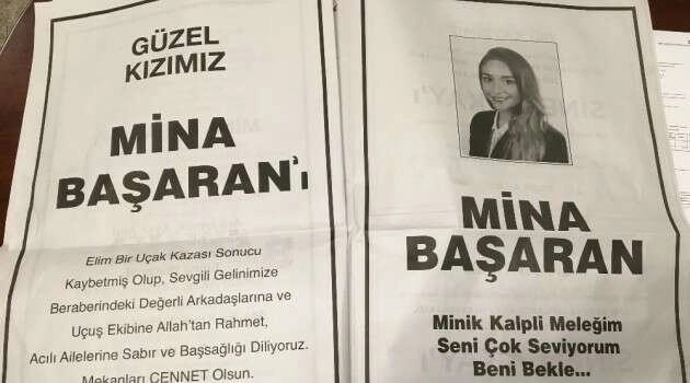 İran’da düşen Türk jetinde hayatını kaybeden Mina Başaran bugün Ataköy Beşinci Kısım’da ikindi namazına müteakiben kılınan cenaze namazının ardından toprağa verilecek. Öte yandan Başaran’ın ailesi ile Nişanlısı Murat Gezer gazetelere ölüm ilanı verdi. Oldukça duygusal ilan veren Başaran’ın ailesi çelenk göndermek isteyenlerin çelenk yerine Mehmetçik Vakfı’na bağışta bulunmasını istedi. Atatürk Havalimanı’nda nişanlısını cenazesini dün teslim almaya giden Başaran’ın Nişanlısı Murat Gezer ise Mina Başaran’ın fotoğrafıyla birlikte "Minik kalpli meleğim. Seni çok seviyorum. Beni bekle. Murty’n" yazılı bir ilan verdi.
