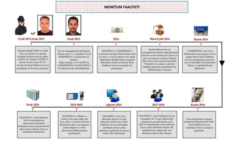 İsrail İstihbarat Servisi mensuplarından aldığı talimat doğrultusunda Veysel Kerimoğlu’nu işe alan ve maaşını bile istihbaratçılardan temin eden Mehmet Budak Derya, arkadaşlık ilişkisi de geliştirdi. M.B. Derya, V. Kerimoğlu ile attıkları her adımı İsrail servisi ile paylaştı. Mehmet Budak Derya, Veysel Kerimoğlu vesilesiyle Orta Doğu ülkelerine yönelik ticari faaliyetlerini arttırdı. Yine V. Kerimoğlu sayesinde tanıştığı, İsrail’in Orta Doğu ülkelerine yönelik politikalarına muhalif Filistinliler ile sosyal ve ticari ilişkilerini geliştirdi. Bu şahıslar hakkında topladığı bilgileri İsrail servisine aktardı. İsrail’in Gazze’yi işgal politikası çerçevesinde tesis ettiği ticari ilişkileri de kullanarak Gazze’ye giriş izni almaya çalıştı. Gazze’de aradığı depoların fotoğraflarını İsrail istihbaratına iletti.
