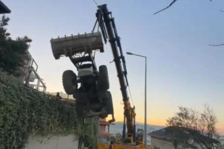 Görüntülerde, vinçte asılı halde bulunan iş makinesinin bir anda dengesini kaybederek yere düştüğü ve çevrede kısa süreli paniğe neden olduğu anlar yer aldı. Olay sırasında iş makinesinin içinde sürücünün bulunmaması ise muhtemel bir faciayı önledi.