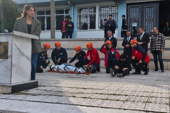 Afet Farkındalık Günü etkinlikleri kapsamında, 18 Kasım tarihinde geniş katılımlı deprem tatbikatı gerçekleştirildi. Tatbikata Bursa İl Millî Eğitim Müdür Yardımcısı Yunus Bulut ve Bursa İl Millî Eğitim Şube Müdürü Cevdet Ataoğlu da katıldı. Tatbikat öncesinde konuşma yapan İl Millî Eğitim Müdür Yardımcısı Yunus Bulut, Türkiye’de yaşanan büyük deprem felaketlerine dikkat çekerek afetlere karşı hazırlıklı olmanın hayati önemine vurgu yaptı. Eğitim camiasının afet bilinciyle hareket etmesi gerektiğini belirtti. Etkinliğe, İşyeri Sağlık ve Güvenlik Birimi Koordinatörü ile birim temsilcileri de iştirak etti. Tatbikat kapsamında öğrencilere deprem anında hayat üçgeni oluşturma, doğru tahliye yöntemleri ve ilk yardım prosedürleri gibi konularda teorik ve uygulamalı Deprem Hazırlık Eğitimi verildi. Millî Eğitim Bakanlığı Arama Kurtarma Birimi (MEB AKUB) organizasyonunda yürütülen tatbikat; Tophane MTAL İtfaiyecilik ve Yangın Güvenliği Alanı, İnsani Yardım Vakfı, UMKE (Ulusal Medikal Kurtarma Ekibi) ve OSB İtfaiye Birimi iş birliğiyle gerçekleştirildi. Kurumlar, tatbikat senaryosunu gerçeğe en yakın şartlarda uygulayarak ekipler arası koordinasyon ve müdahale kabiliyetlerini başarıyla sergiledi. Okul bahçesinde MEB AKUB, UMKE ve OSB İtfaiye tarafından kurulan afet farkındalık stantları, öğrenciler ve ziyaretçiler tarafından büyük ilgi gördü. Standlarda afet çantasının içeriği, kurtarma teknikleri ve acil durum ekipmanları hakkında uygulamalı bilgilendirmeler yapıldı. Bursa İl Millî Eğitim Müdürlüğü, gerçekleştirilen bu tür tatbikatlarla eğitim kurumlarında görev yapan öğrenci ve personelin afetlere karşı hazırlık düzeyini artırmayı ve dirençli okul kültürünü yaygınlaştırmayı amaçlamaktadır.