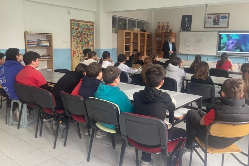 Belediye Çevre Koruma ve Kontrol Müdürü Yaşar Demirdirek ve Çevre Mühendisi Çiğdem Polatsivri’nin sunum yaptığı seminerlerde geri dönüşüm süreçlerinin önemi, atık yağlar, geri dönüşüm ve çevreye zarar vermeyen tüketim alışkanlıklarının geliştirilmesi ele alınıyor. Özellikle ilçenin en önemli sorunlarından biri olan deniz kirliliği ve müsilaj tehlikesi hakkında uzman görüşlerine yer verilerek, bilimsel veriler ışığında bilgilendirme yapılıyor. Eğitmenler, iklim değişikliği, denizlerde meydana gelen kirlilik ve deniz suyu sıcaklığının deniz salyalarının oluşumuna sebep olduğunu vurgularken, bu durumun önüne geçebilmek için ilgili kurumların gerekli önlemleri almasının önemine dikkat çekiyor. Müsilajla ilgili fotoğraf ve video görselleri eşliğinde yapılan sunumlarla konunun etkileri gözler önüne seriliyor. Atıkların ayrıştırılması için evlerde ve okullarda basit sistemler kurulabileceği, bu sayede geri dönüşüm süreçlerinin daha etkin hale gelebileceği belirtilirken; plastik kullanımını azaltmak, geri dönüşüm malzemelerini tercih etmek ve doğaya zarar vermeyen ürünleri kullanmanın uzun vadede çevre üzerinde olumlu etkiler oluşturacağı anlatılıyor. Eğitimlerde yapılan görsel sunumlarla öğrencilerin dikkatini çeken uzman eğitmenler, sıfır atık bilincinin günlük hayatın bir parçası haline getirilmesi gerektiği konusunda da ayrıca öğrencileri bilinçlendiriyor.