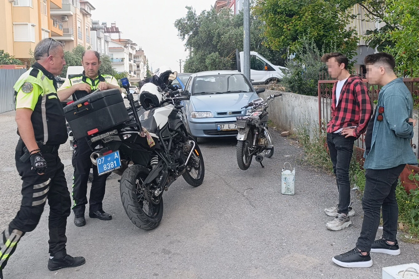 Antalya’nın Manavgat ilçesi Emek Mahallesi’nde, seyir halindeki bir motosiklet sürücüsü yol üzerindeki trafik ekiplerini görünce kaçmaya başladı. Kısa süreli kovalamacanın ardından plakasız motosiklet 3040 sokak üzerinde polis ekiplerince yakalandı. Trafik ekibinin yaptığı kontrolde motosikleti kullanan Ali K.’nin sürücü belgesinin olmadığı belirlendi. Motosikletin plakasının tespiti için yapılan incelemede motosikletin şase ve motor numaralarının silinmiş olduğu belirlendi. Sürücüye 19 bin 677 TL para cezası Manavgat Emniyet Müdürlüğü Trafik Denetleme Büro Amirliği ekipleri motosiklet sürücüsüne sürücü belgesi olmadan araç kullanmaktan 18 bin 677 TL, kask takmamaktan 993 TL olmak üzere toplam 19 bin 677 TL para cezası uyguladı. Motosiklet ve sürücü Ali K. olay yerine çağrılan Asayiş Büro Amirliği ekiplerince adli işlem yapılmak üzere Cumhuriyet Polis Karakoluna götürüldü.