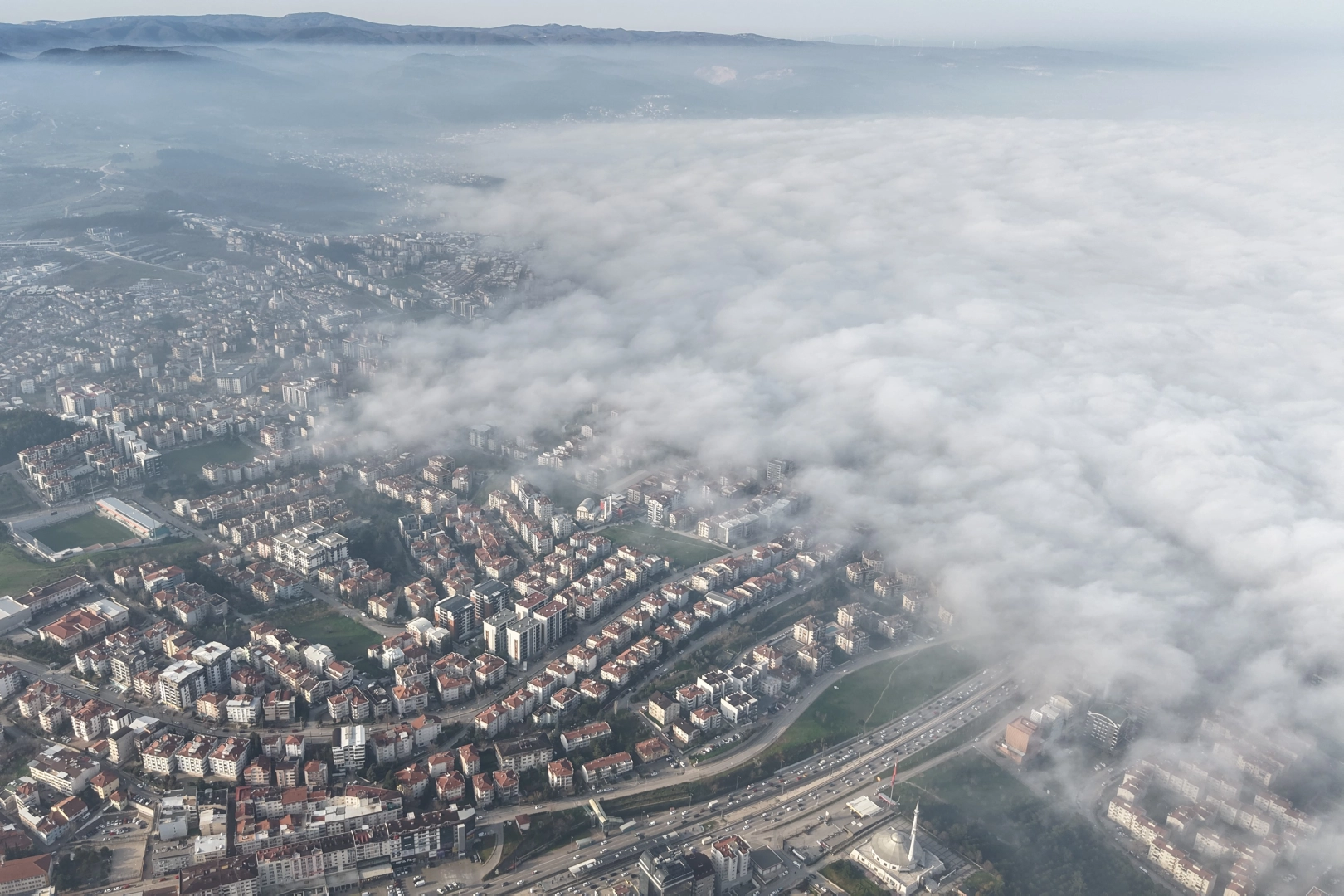 Bursa'da sabah saatlerinde etkili olan yoğun siste görüş mesafesi 15 metre olarak ölçülürken, trafikte aksamalara sebep olmadı. Bursa'nın Nilüfer ilçesinden itibaren batı tarafına doğru etkili olan sis, film sahneleri gibi görüntüler ortaya koydu. Sis bulutlarının üzerinde seyreden dron kamerası Şehrin bir ucundan diğer ucuna kadar oluşan manzarayı anbean görüntüledi. Film sahnelerindeki gibi bir manzara izleyenleri mest etti.