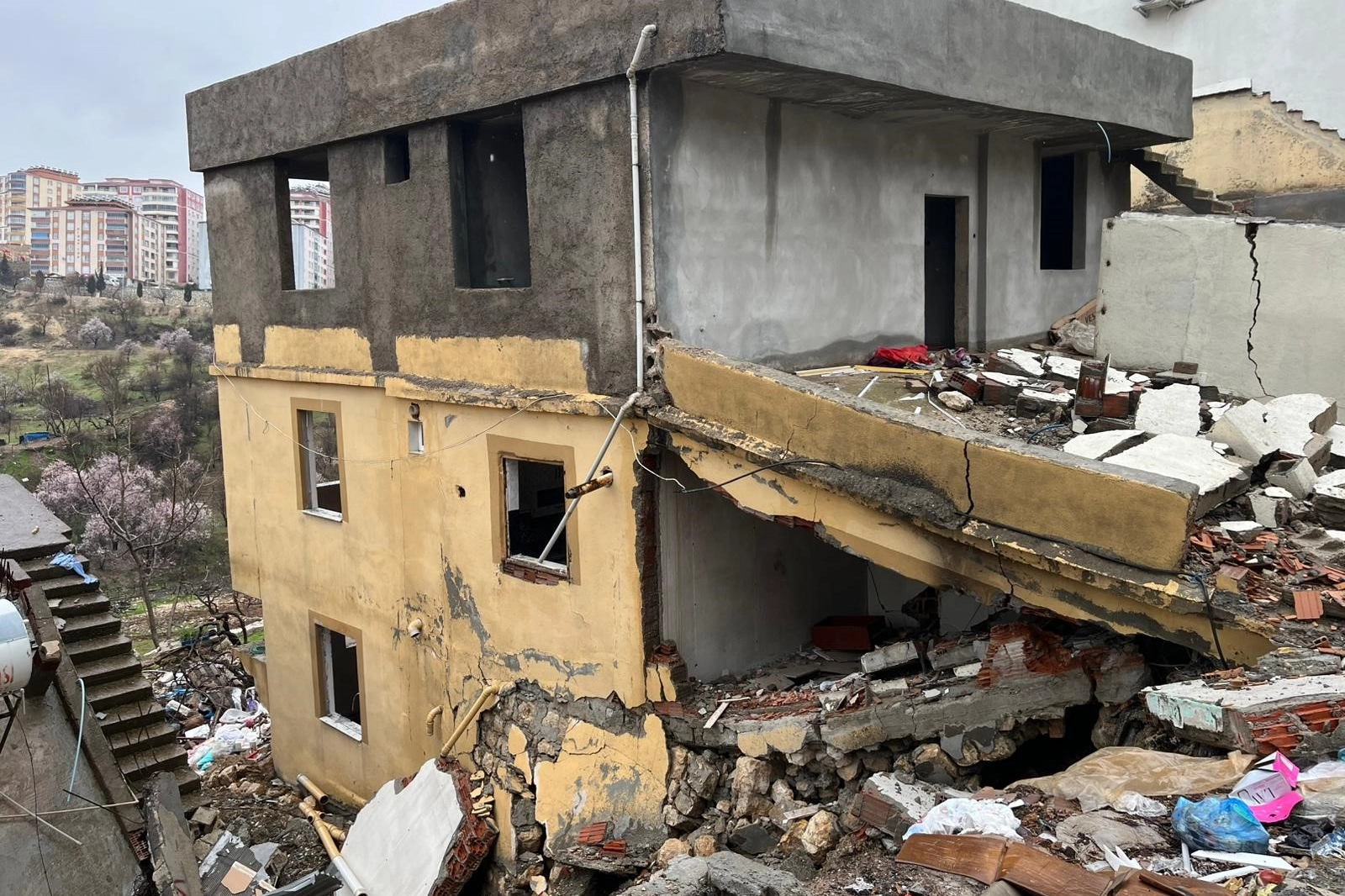 Besni ilçe merkezinde Saniye Solak'a ait olduğu öğrenilen 2 katlı ağır hasarlı bina, geçtiğimiz günlerde alınan karar sonrası tahliye edilmişti. Son günlerde etkisini artıran yağışların ardından binada çökme meydana geldi. Olay sırasında binada kimsenin bulunmaması muhtemel bir faciayı önledi.