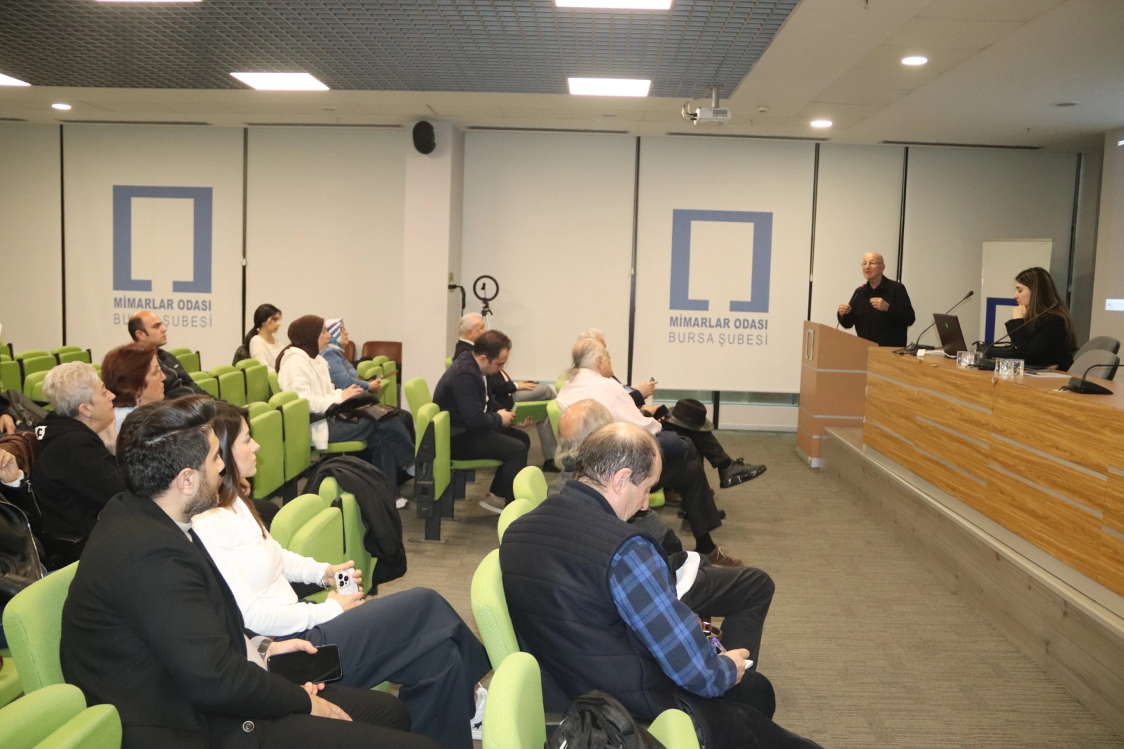 Konuşmalarından ardından Mimar M. Fatih Aydın, MSGSÜ Mimarlık Bölümü Öğretim Üyesi Prof. Dr. Oğuz Ceylân’a, Mimarlar Odası Bursa Şubesi Yönetim Kurulu Üyesi Kurtuluş Göktaş da Yüksek Mimar Deniz Ezgi Ünlü’ye etkinliğe katılımlarından dolayı teşekkür belgesi takdim etti.