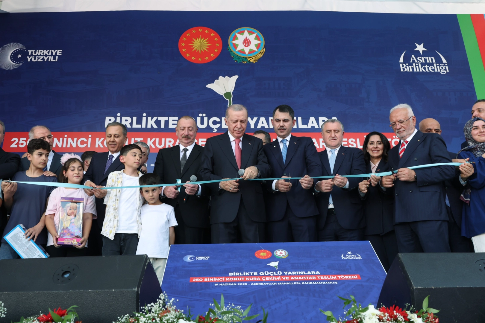 Asrın felaketi, 6 Şubat depremlerinin merkezi Kahramanmaraş ağır hazar almıştı. Depremin hemen ardından Azerbaycan bölgeye önemli miktarda yardım malzemesi ve arama kurtarma ekipleri gönderdi. Azerbaycan hükümeti ayrıca Kahramanmaraş'ta bin 183 konut ve bin 595 dükkandan oluşan Azerbaycan'ın Mahallesi'nin inşasını üstlendi. İnşası tamamlanan konut ve dükkanlar bugün Cumhurbaşkanı Recep Tayyip Erdoğan ve Azerbaycan Cumhurbaşkanı İlham Aliyev'in katıldığı törenle hak sahiplerine teslim edildi. Törenle ayrıca depremin etkilendiği illerde TOKİ tarafından yapımı tamamlanan 49 bin 56 iş yeri ve konutun da kurası ve anahtar teslimleri gerçekleştirildi. Kurası çekilen ve anahtar teslimleri yapılan konutlarla birlikte toplam teslim edilen konut sayısı 250 bini geçti. "53 bin 735 canımızı toprağa verdik. Burada konuşan Cumhurbaşkanı Recep Tayyip Erdoğan, 6 Şubat depremlerinde 53 bin 735 canın toprağa verildiğini hatırlatarak, "Türkiye ile Azerbaycan arasındaki gelecek birliğinin en somut örneklerinden biri, açılışını yaptığımız konutlardır. Biliyorsunuz, 6 Şubat 2023'te tarihimizin en büyük doğal afetlerinden birini yaşadık. Geçmişten bugüne pek çok acı hatıralarımız oldu. Ama o sabah 11 ilimizde gördüğümüz yıkım ve elem hepsinden ayrıydı. 12.796'sı Maraş'ta olmak üzere 53.735 canımızı toprağa verdik. Rabbim bizlere böyle bir acıyı tekrar yaşatmasın diyorum. Bu vesileyle depremde hayatını kaybeden kardeşlerimize bir kez daha Allah'tan rahmet, gelecek kalan kardeşlerime sabırlar diliyorum. Hamdolsun depremin ilk anından beri inancımızı hiç yitirmedik. Yaşadığımız imtihan karşısında bir gün bile ümitsizliğe kapılmadık. Milletimizle gönül gönüle verdik ve süratle kendimizi toparladık. Şimdi sevgili edeler, bu zorlu süreçte ülkemizin imdadına ilk koşanlardan biri canlı Azerbaycan'dır. Felaketin haberini alır almaz, seninleyim Türkiye'm diyerek, Kardeşlik örneği başlatan, arabasının tavanına varını yoğunu sararak milletimize yardım etmeye çalışan, duaları, destekleri, samimi gözyaşlarıyla acımızı paylaşan Azerbaycan halkının dayanışmasını hiçbir zaman unutamayız ve unutmayacağız. Özellikle İlham kardeşimiz ve saygıdeğer refikası Mehriban Hanım'ın yardım seferberliğimize verdiği güçlü katkının gönlümüzde hep ayrı bir yeri var "dedi.