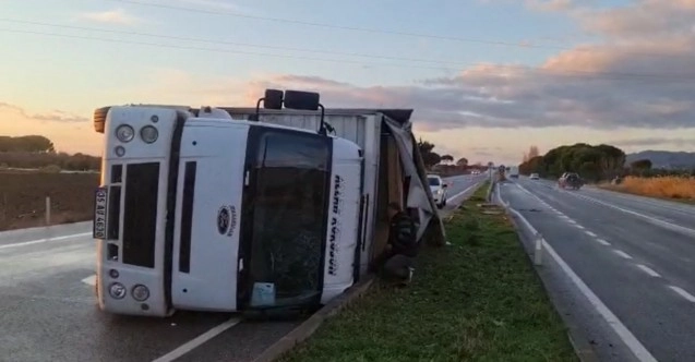 Balıkesir’in Ayvalık ilçesinde sürücüsünün hâkimiyetinden çıkan TIR yolun ortasında yan yatarak devrildi. Kazada hafif yaralanan TIR şoförü yan dönen araçtan güçlükle dışarı çıkabildi.