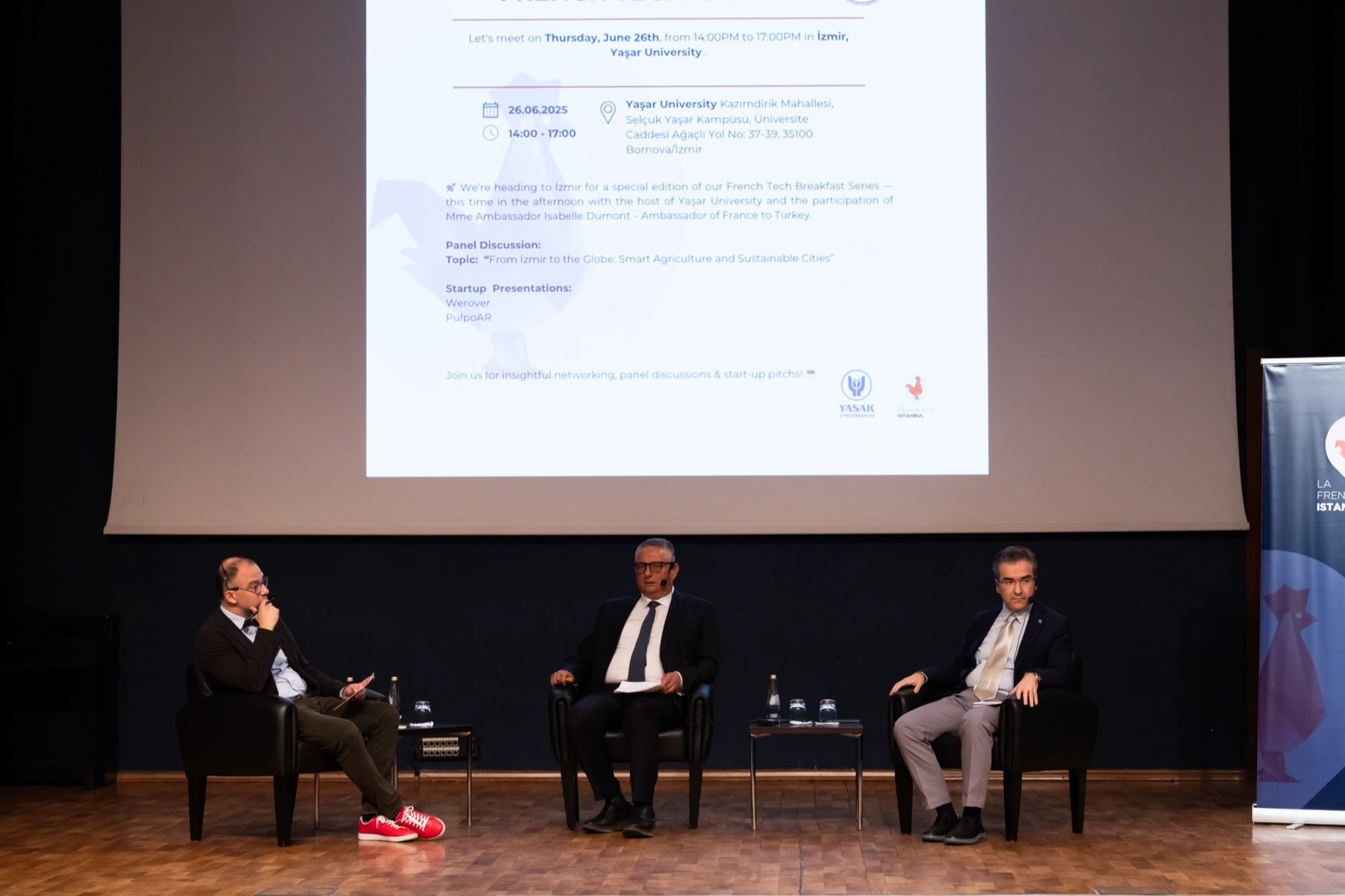 La French Tech İstanbul Yönetim Kurulu Üyesi Eren Arasan da konuşmasında, Türkiye’de girişimcilik ekosistemini güçlendirmek ve Fransa ile iş birliği fırsatlarını artırmak için yürütülen ağ oluşturma etkinliklerine ve topluluk faaliyetlerine değindi. Akıllı tarım, yapay zeka Etkinlikte, Business France Türkiye Yatırım Uzmanı Cécile Lavigne tarafından "Fransa’nın Türk Girişimcilere Sunduğu Destekler" başlıklı sunum gerçekleştirildi. Lavigne, Fransa’nın girişimcilik ekosistemine yönelik teşvik mekanizmaları, yatırım fırsatları ve Türk girişimcilerin Fransa pazarına erişimini kolaylaştıran programlar hakkında bilgi verdi. Lavigne ayrıca, enerji, tarım ve gıda teknolojileri ve yapay zeka alanlarının Fransa’nın öncelikli yatırım alanları arasında yer aldığını belirtti. EIT Food’da tek türk üniversite La French Tech İstanbul Yönetim Kurulu Üyesi ve aynı zamanda EIT Türkiye Topluluğu Yöneticisi Ömer Hantal’ın moderatörlüğünü üstlendiği panelde Yaşar Üniversitesi Rektör Yardımcısı Prof. Dr. Yiğit Kazançoğlu, üniversitenin akıllı tarım ve sürdürülebilir akıllı şehirler alanındaki araştırma, yenilikçilik ve uluslararası iş birliklerine odaklanan çalışmalarını aktardı. Üniversitede yer alan birçok bölümün sürdürülebilirlik ve dijitalleşme odağında müfredat, yayın ve proje faaliyetlerini dönüştürdüğünü belirten Kazançoğlu, İzmir’deki dörtlü sarmal modelin bölgesel kalkınma ve uluslararası yatırımlarda önemli rol oynadığını ifade etti. Kazançoğlu ayrıca, Yaşar Üniversitesi’nin Avrupa Birliği tarafından desteklenen, gıda ve tarım alanında inovasyon ve girişimciliği teşvik etmek üzere kurulan bir topluluk olan EIT Food ağına Türkiye’den katılan ilk ve tek üniversite olarak Avrupa ile güçlü iş birlikleri yürüttüğünü ve genç girişimcileri destekleyen programlara ev sahipliği yaptığını dile getirdi.