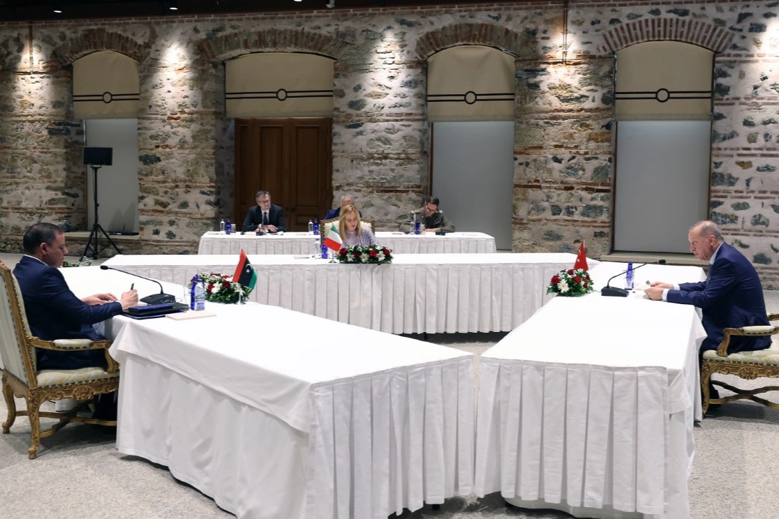 Cumhurbaşkanı Recep Tayyip Erdoğan, İtalya Başbakanı Meloni ve Libya Başbakanı Dibeybe'yi Dolmabahçe Çalışma Ofisi'nde kabul etti. Zirvede Akdeniz'deki enerji başta olmak üzere, Filistin'de yaşananlar ve düzensiz göçle mücadele konuları ele alındı.
