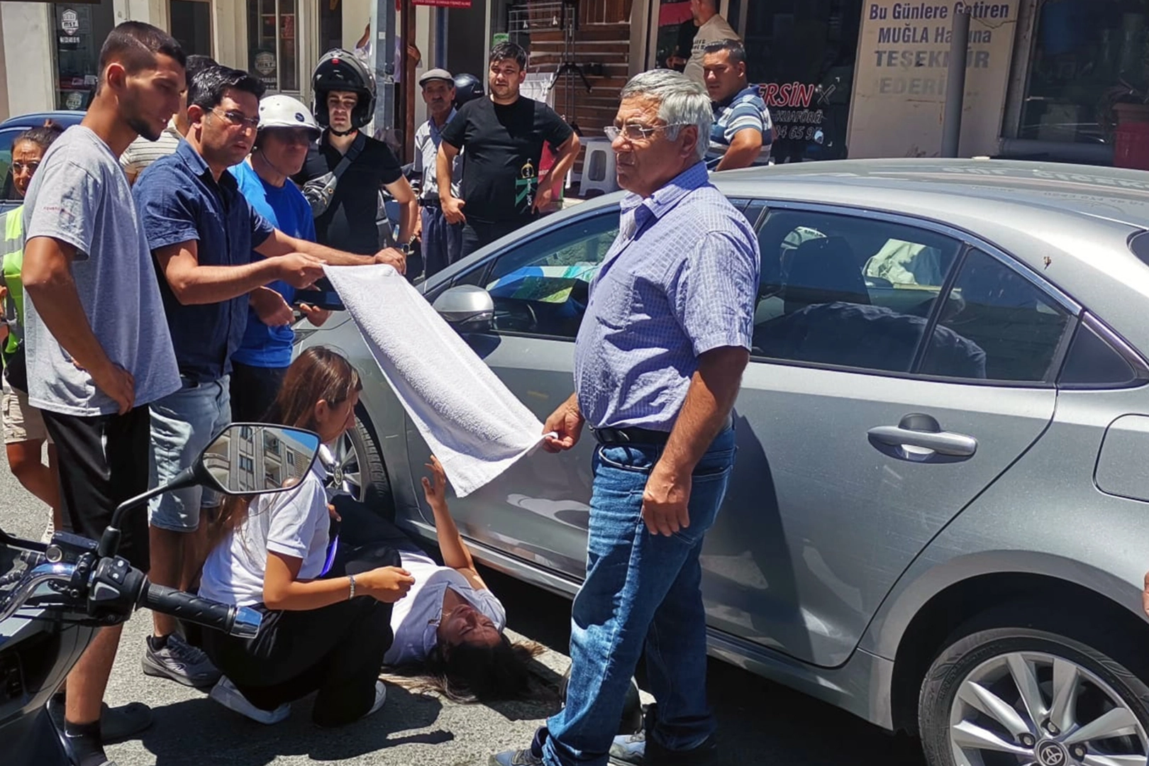 Sıcak hava nedeniyle yerde yatan kadının güneşten etkilenmemesi için vatandaşlar, üzerine havlu örterek gölgelik oluşturdu. Olay yerine sağlık ve polis ekipleri sevk edildi. İlk müdahalesi olay yerinde yapılan kadın sürücü, ambulansla hastaneye kaldırıldı.