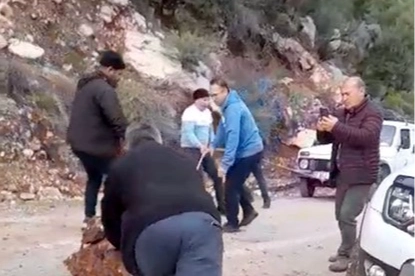 Yola düşen kayaları iple araca bağlayıp çektiler