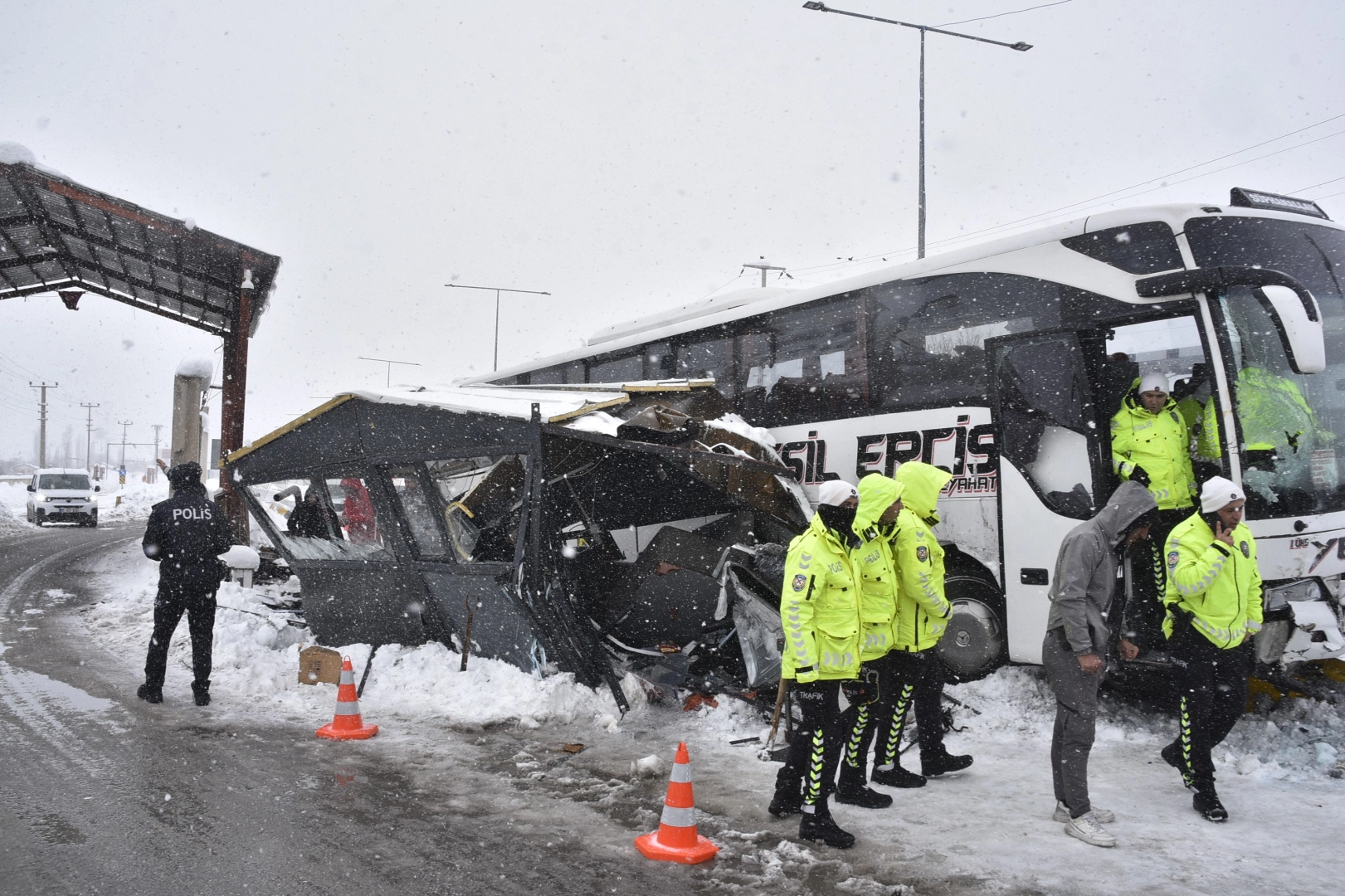 Diyarbakır'dan Bitlis istikametine gelen C.D. yönetimindeki Yeşil Erciş firmasına ait 46 AEG 334 plakalı yolcu otobüsü, Arıcılık mevkiinde kar yağışı nedeniyle sürücüsünün direksiyon hakimiyetini kaybetmesi sonucu kontrol noktasındaki polis kulübesine çarptı. Haber verilmesi üzerine bölgeye 112 Acil Sağlık ve polis ekipleri sevk edildi. Kazada, kulübedeki 4 polis memuru hafif yaralandı. Olay yerinde yapılan incelemelerin ardından otobüs, iş makinesiyle bulunduğu yerden kaldırıldı. Kaza sonrası otobüste bulunan yolcular başka bir araca nakledilerek Bitlis Otogarı'na götürüldü. Kazayla ilgili inceleme başlatıldığı belirtildi.