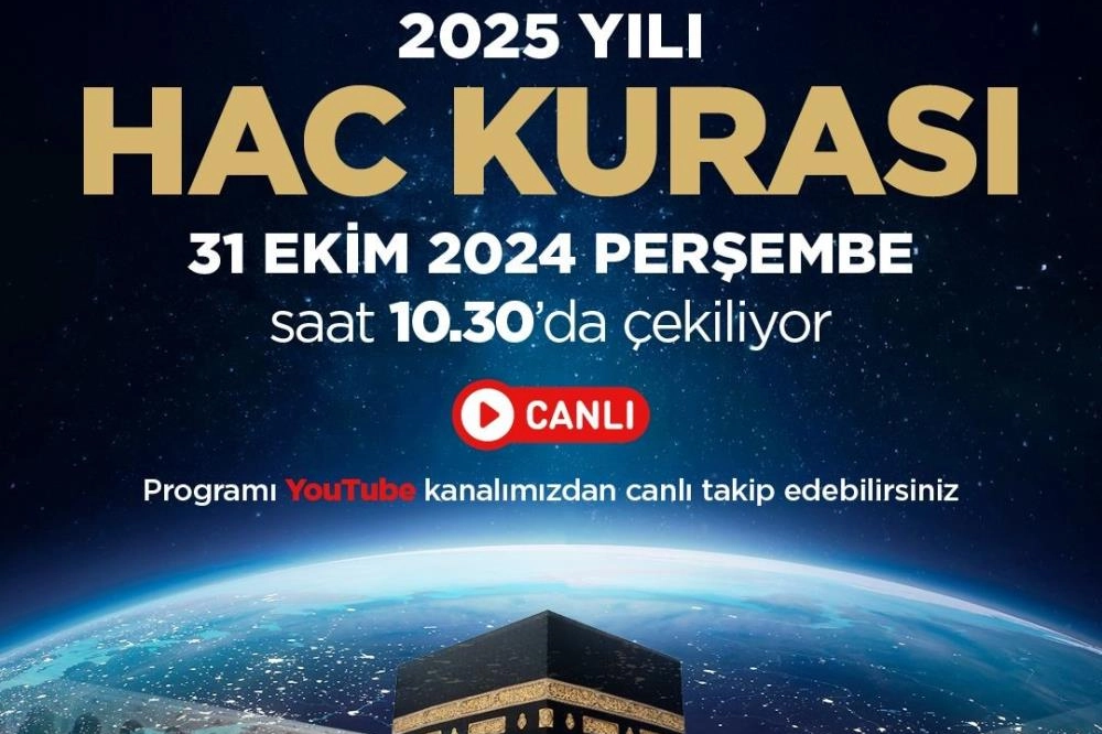 Milyonlarca hacı adayının hasretle beklediği 2025 yılı hac kurası yarın saat 10.30'da Diyanet İşleri Başkanlığı 15 Temmuz Milli İrade Şehit Ali Alıtkan konferans salonunda gerçekleştirilecek. Kura çekilişi, noter ve basının huzurunda vatandaşların katılımıyla yapılacak. Vatandaşlar, kura çekimini Diyanet İşleri Başkanlığı Hac ve Umre Hizmetleri Genel Müdürlüğünün YouTube kanalından canlı olarak takip edebilecek.