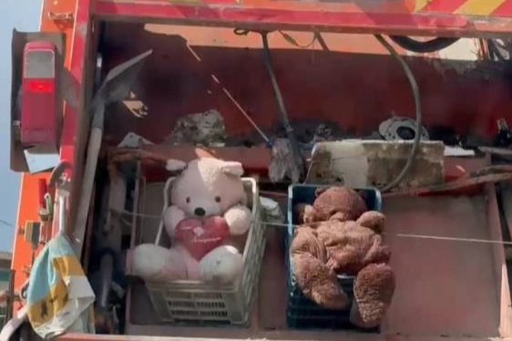 Bayramda da İnegöl ilçesinin temizliğine önem veren temizlik görevlileri, çöp toplamaya devam ediyorlar. Çöp kovalarındaki çöpleri kamyonun arkasına atan görevliler, çöpe atılan iki oyuncak ayıyı kamyonun içine atmaya kıyamayınca ortaya güzel görüntüler çıktı. Görevliler ayıları kamyonun arkasına astılar. O anlar, Ortaköy Mahallesi'nde bir sürücünün amatör kamerasına yansıdı.