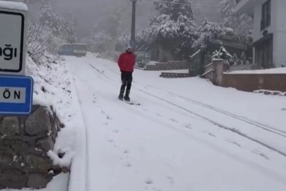 Merkez Yıldırım ilçesi Piremir Mahallesi'nde sabah saatlerinde etkili olan kar yağışı sonrası beyaza bürünen yollarda kayak takımıyla kayan vatandaş, çevredeki vatandaşların ilgisini çekti. O anlar cep telefonu kamerasıyla kaydedildi.