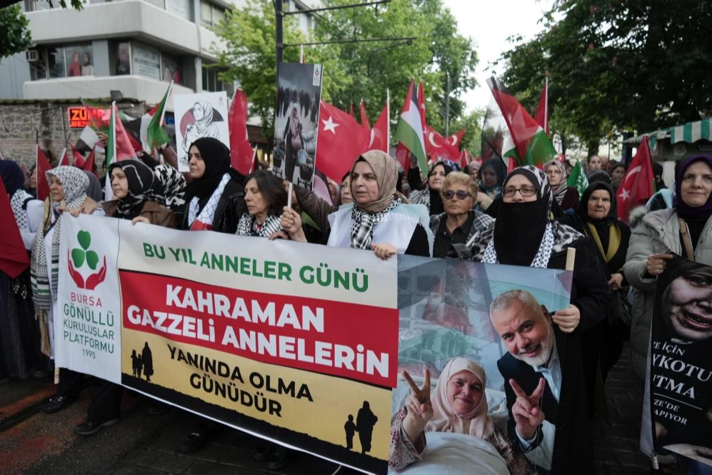 İsrail-Filistin savaşı 218. günü geride bırakırken yüzlerce çocuk ve sivil hayatını kaybetti. Bursa’da tarihi Ulu Cami önünde toplanan yüzlerce kişi Anneler Günü vesilesi ile Filistinli anne ve çocuklar için bir araya geldi. Orhangazi Parkı’nda yürüyüşe başlayan grup sloganlar eşliğinde 15 Temmuz Demokrasi Meydanı’na ilerledi. Burada basın açıklaması yapan Bursa Gönüllü Kuruluşlar Platformu Kadınlar Başkanı İmran Tezcan, “Tam 218 gündür kadın, çocuk demeden, tüm masumların katledildiği, soykırıma şahitlik eden dünya, şanlı Filistin direnişi karşısında bir tercih yapmak durumunda kalmıştır. Zulme rıza gösterenler ve zulme karşı direnenler. Bizler zulmü sona erdiremesek de, direnen Gazze halkının yanında olduğumuzu, haykırmak için bir kez daha toplandık. Annelik, Gazze’de bambaşka bir anlam kazanmıştır. Gazze’de annelik, şehit olan evladını Rabbine uğurlarken, geride şehit olacak evladı olduğuna sevinmektir. Gazze’de annelik, yetim kalan yavrularını bin bir meşakkatle doyurup, her şeye rağmen ayakta kalabilmektir. Gazze'de annelik, bu davayı ardından yürütecek nesillerin önünde; vakarla, sabırla, dirençle dimdik durabilmektir. Aylardır kar, kış demeden her yaştan, her inançtan, her milletten insanlar bu zulme dur diyebilmek için sokaklara döküldüler. Kimse onlara ses çıkarmadı. Kar üstünde yattılar, gösteri yaptılar, banliyölerde, meydanlarda eylemler yaptılar, kimsenin sesi çıkmadı. Ama bir gün gençler ayaklandı. Üniversite kampüslerinde, dünyanın en prestijli üniversitelerinde çadırlarda kalıp gösteriler yaptılar ve polis zulmüyle karşılaştılar. Çünkü Genç demek, gelecek demek. Siyonist İsrail ve onun en önemli hamisi ABD bundan rahatsız oldu. Gençlerle bu davanın geleceğe taşınacağını biliyorlardı. İşte bizler bugün, kapitalizmin bize dayattığı, tüketimi körükleyip, duygularımızı yozlaştıran, Anneler Günü’nü bambaşka bir şekle büründürmek için toplandık. Bizi uyandırıp kendimize getiren, hangi görüşten, hangi milletten olursak olalım bizi birleştiren, Gazze davasını gelecek nesillere aktaracak anneler. Evlatlarımıza Gazze’deki kahraman anneleri ve çocuklarını gösterelim. Her şeyi tiyatro sahnesi gibi izlediğimiz ve duyarsızlaştığımız şu dönemde, Aksa davasını unutturmamak en büyük ve en öncelikli vazifemizdir. Ey dünyaya unutmayacağı bir ders veren Gazze'li anneler. Bizim sizden öğrenecek çok şeyimiz var. Gönlümüz, dualarımız sizinle ve zafere olan inancımız tam. Bugün sizlerin, kahraman Gazze'li annelerin, yanında olma günüdür. Bursa Gönüllü Kuruluşlar platformu adına Filistin'in sesini yükselten tüm Bursalı (annelere) kardeşlerimize teşekkür ediyoruz” şeklinde konuştu.