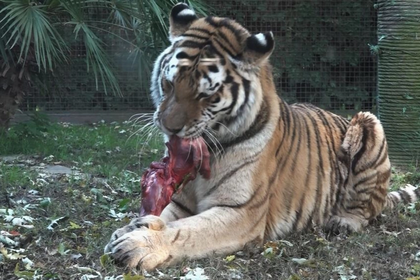 Direğin üzerine bakıcısı tarafından asılan etin kokusunu alan amur kaplanı, yuvasından çıktıktan sonra gözüne kestirdiği eti tek hamlede kaptı. Afiyetle etini yiyen kaplan, bu egzersizlerle ormanda yaşamış gibi zinde ve çevik kalıyor.