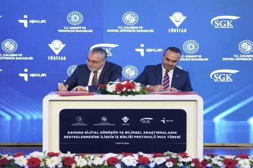 Çalışma ve Sosyal Güvenlik Bakanlığı ile Sanayi ve Teknoloji Bakanlığı arasında Kamuda Dijital Dönüşüm ve Bilimsel Araştırmaların Desteklenmesine İlişkin İş Birliği Protokolü İmza Töreni, Türkiye Bilimsel ve Teknik Araştırma Kurumu(TÜBİTAK) Binası’nda düzenlendi. İmza törenine Sanayi ve Teknoloji Bakanı Mehmet Fatih Kacır ve Çalışma ve Sosyal Güvenlik Bakanı Vedat Işıkhan katıldı. Törende konuşan Işıkhan, “İş arayan ile işveren arasındaki en sağlam köprü olma vazifesi üstlenen İŞKUR'un, vatandaşlarımıza sunduğu birçok hizmete çevrim içi olarak erişebiliyoruz. Bu anlamda bugün imzalayacağımız protokolün, İŞKUR'un dijital dönüşümüne önemli bir katkı sağlayacağına inanıyoruz. Ülkemizin bilim ve teknoloji politikaları alanındaki en saygın ve köklü kuruluşlarından biri olan TÜBİTAK ile gerçekleştirilecek protokol sayesinde İŞKUR'un, hem yapay zeka destekli sisteminin geliştirilmesi hem de istatistik altyapısının güçlendirilmesi sağlanmış olacak” ifadelerini kullandı. Projenin hayırlı olmasını temenni ederek konuşmasına başlayan Kacır, “Teknolojik ürünler ve hizmetler dijital çağ olarak da ifade edilen 21. yüzyılda artan bir ivme ile hayatımızı dönüştürmeye ve değiştirmeye devam ediyor. Yapay zeka nesnelerin interneti ve robotik gibi yenici teknolojiler günlük yaşam pratiklerimize alışkanlıklarımıza karar alma mekanizmalarımıza istikamet veriyor” dedi. “Bürokrasiyi en aza indiriyoruz” Kurumlar arası bilgi paylaşımını güçlendirerek kamuda hizmet sağlayıcıları arasındaki etkileşimi yükselttiklerini ifade eden Kacır “Tüm dünyada hükümetler ve kamu otoritelerinin kamu hizmetlerini ve programlarını daha verimli ve şeffaf sunabilmesi için tarihi bir fırsat oluşturuyor. Bizler de gerçekleştirdiğimiz dijitalleştirme projeleri ile vatandaşlarımıza sunduğumuz hizmetlerde bürokrasiyi en aza indiriyoruz. Kurumlar arası bilgi paylaşımını güçlendirerek kamuda hizmet sağlayıcıları arasındaki etkileşimi yükseltiyoruz. Vatandaşlarımıza sunduğumuz hizmetlerde kalite ve hızı odak hale getiriyoruz. Aynı zamanda kamu olarak sahip olduğumuz verileri bir kaynak olarak görüp onu stratejik bir biçimde değerlendirerek çalışmalarımıza veriye dayalı olarak yön veriyoruz” dedi. Yapılan program ve projelerin etkinliğini ölçtüklerini belirten Kacır, vatandaşların devlette olan tüm işlemlerini dijital bir ortamda saniyeler içinde evlerinden veya cep telefonlarından yapabilmelerini sağlayan E- Devlet’in kuşkusuz bu çalışmaların vitrinin de yer alan uygulamalardan en önemlisi olduğunu dile getirdi. Bakanların konuşmasının ardından Kamuda Dijital Dönüşüm ve Bilimsel Araştırmaların Desteklenmesine İlişkin İş Birliği Protokolü imzalandı.