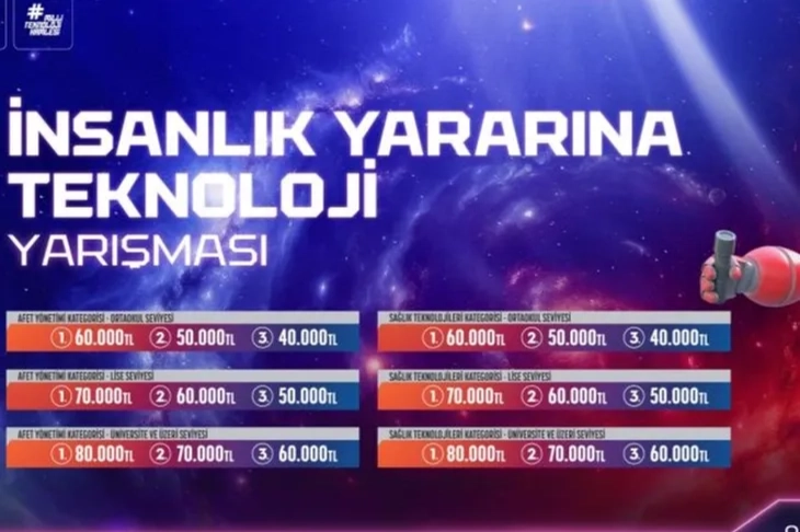 İnsanlık yararına teknoloji yarışmasında yarışmacılar afet yönetimi ve sağlık teknolojileri olmak üzere 2 farklı kategoride yarışıyor. Yarışma kapsamında, sağlık ve ilk yardım ile afet yönetimi alanlarında karşılaşılan sorunlara yenilikçi çözümler sunan, hayatı kolaylaştıran ve milli kaynaklarla geliştirilen projeler ödüllendirilecek. Dereceye giren yarışmacılara toplamda 1 milyon TL’yi aşan ödüller takdim edilecek.