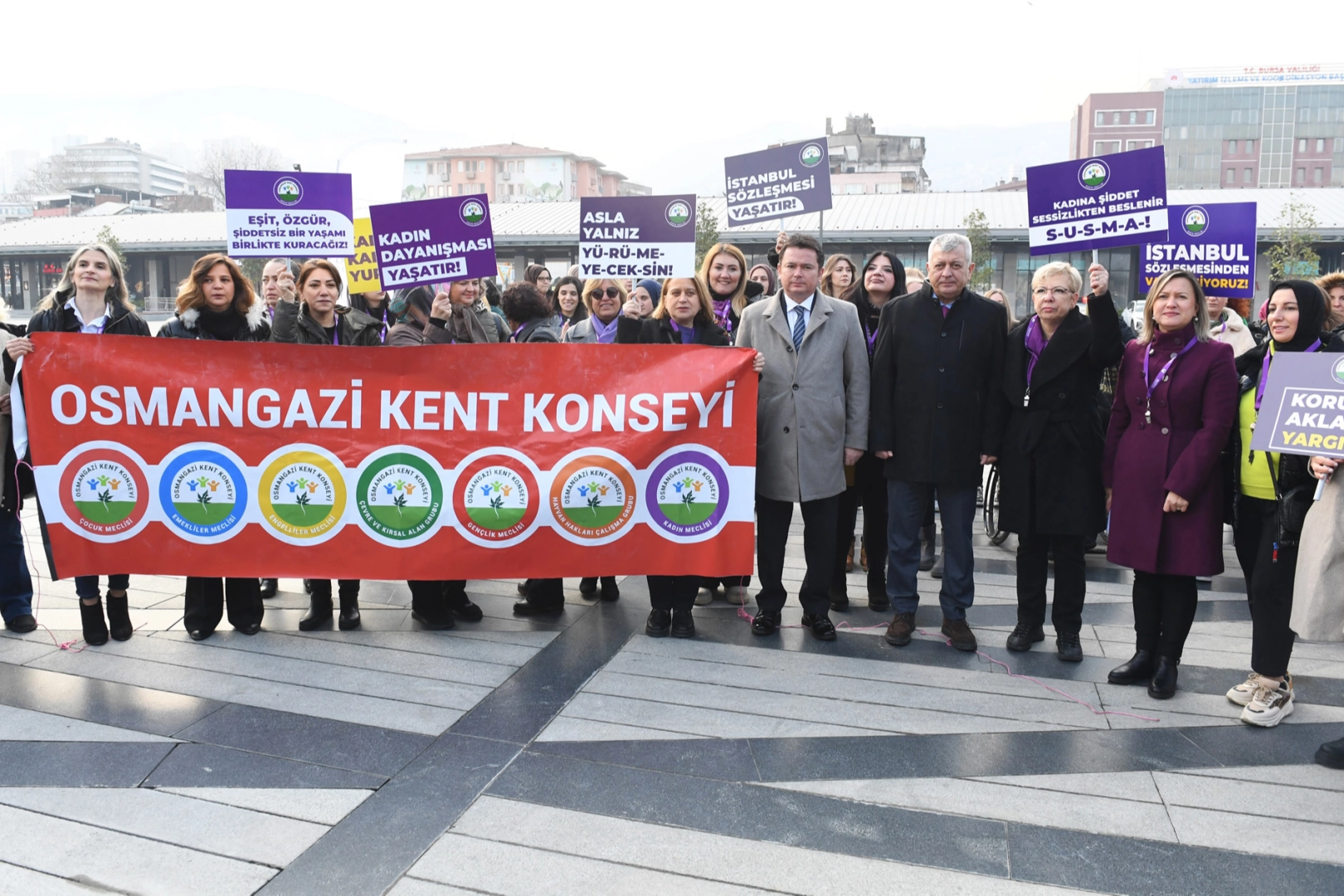 Kadına yönelik şiddetle mücadele konusunda toplumsal farkındalık oluşturmanın hedeflendiği basın açıklamasında, ‘eşit, özgür, şiddetsiz bir yaşamı birlikte kuracağız’ mesajı verildi. Osmangazi Meydanı’nda düzenlenen basın açıklamasına Osmangazi Belediye Başkanı Erkan Aydın, Osmangazi Kent Konseyi Başkanı Fatma Çil Yılmaz, Osmangazi Kent Konseyi Başkanı Sevgi Baysal, belediyedeki kadın personeller ile kadına yönelik şiddete dur diyen onlarca kadın katıldı.
